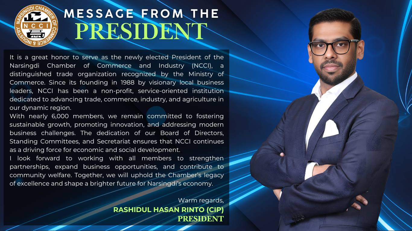 The Narsingdi Chamber of Commerce and Industry (NCCI) is a legitimate trade organization recognized by the Ministry of Commerce, Government of Bangladesh. It was established in 1988 through the collective efforts of local businesspeople.