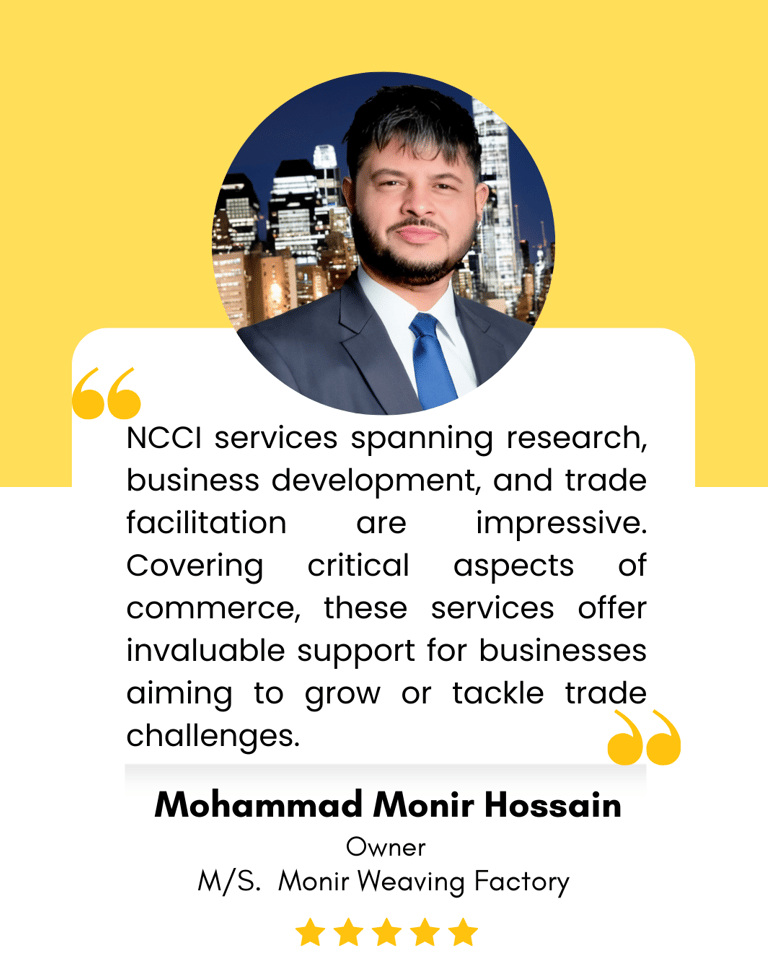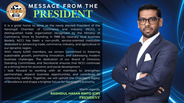 The Narsingdi Chamber of Commerce and Industry (NCCI) is a legitimate trade organization recognized by the Ministry of Commerce, Government of Bangladesh. It was established in 1988 through the collective efforts of local businesspeople. NCCI stands as an exemplary non-profit, service-oriented organization and has grown to become one of the leading A Class chambers in the country. Similar to other chambers, NCCI comprises businesses, companies, and corporate entities involved in various sectors such as trade, commerce, industry, agriculture, and manufacturing.